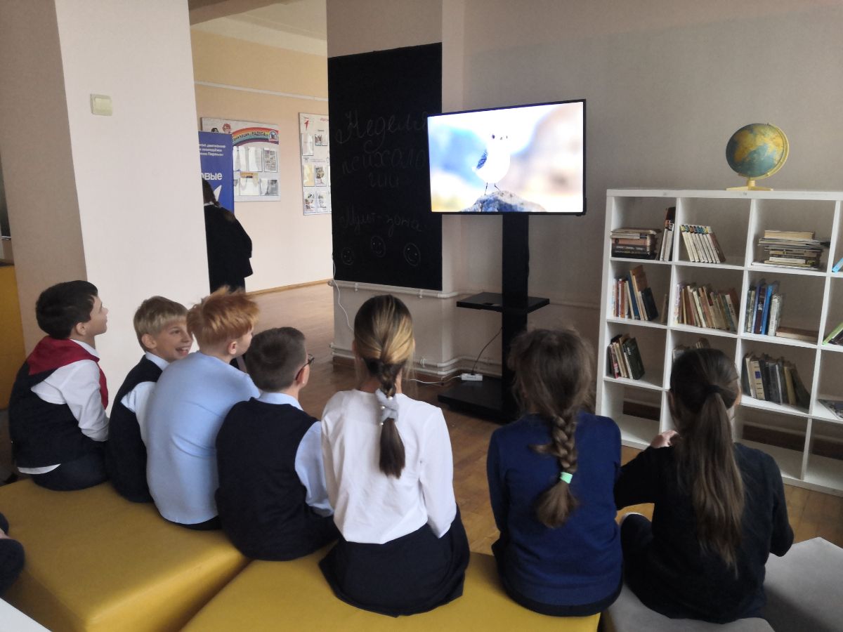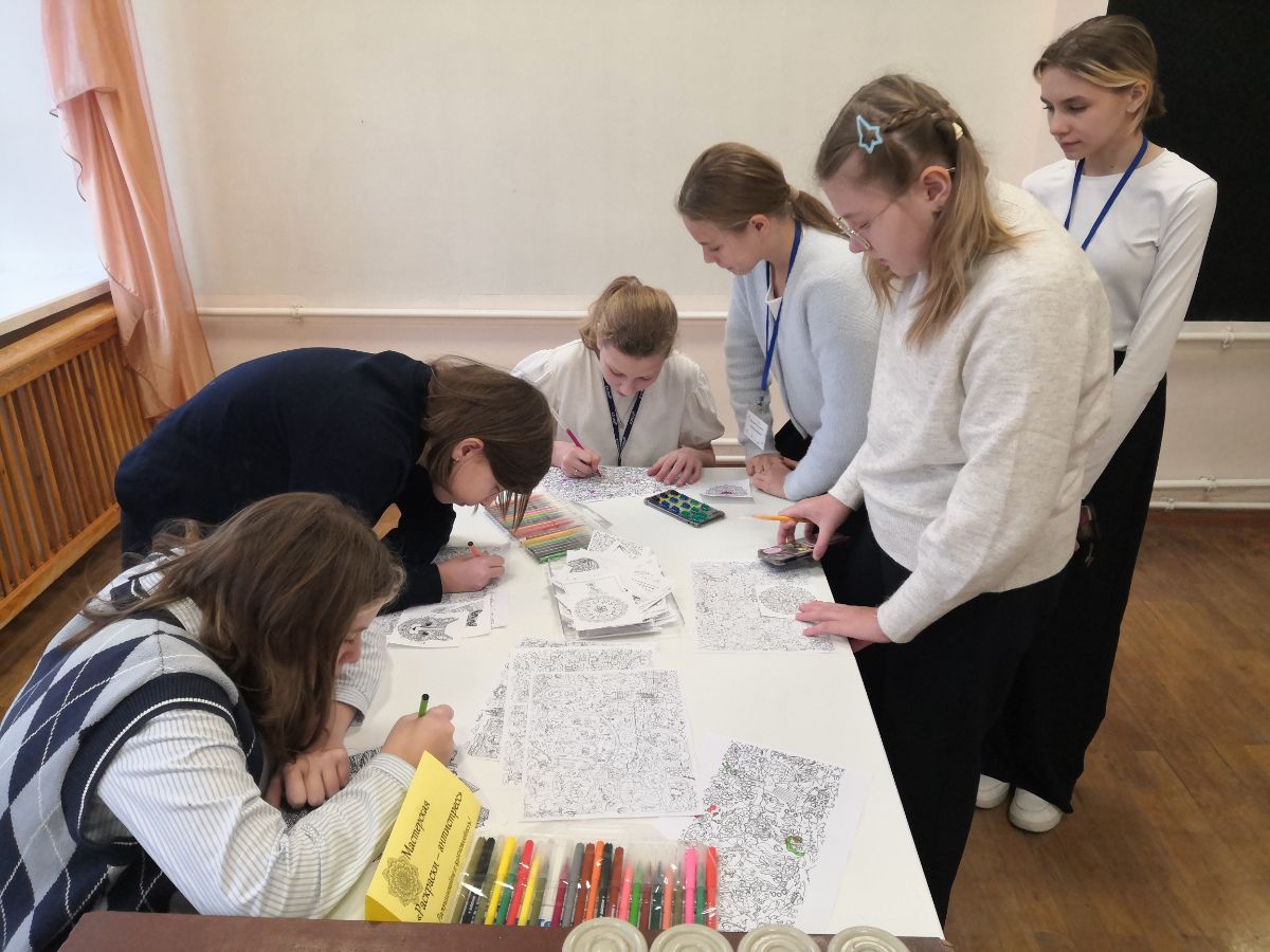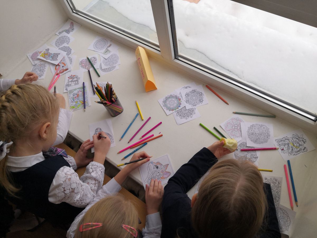 - На переменах ребята прибегали в холл второго этажа, чтобы не пропустить новые психологические мультфильмы и принять участие в мастерской «Раскраски-антистресс».