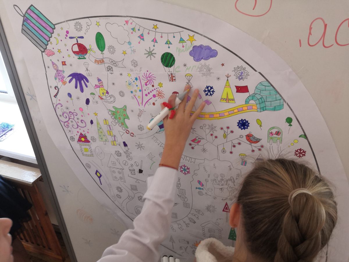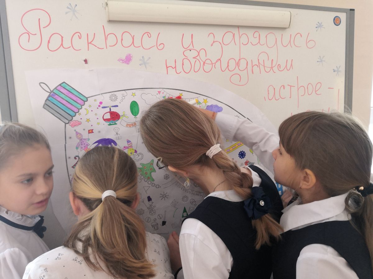 А для всех ребят по школе были развешены огромные антистрессовые раскраски на новогоднюю тематику. Раскрашивали, общались, успокаиваились и заряжались новогодним настроением ...