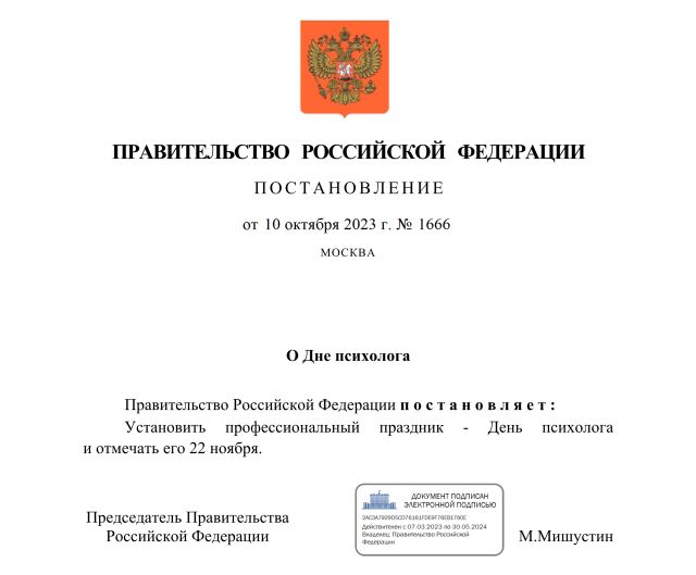 10 октября 2023 г. председатель Правительства Российской Федерации Михаил Мишустин подписал постановление «О Дне психолога». Опубликовано постановление 14 октября.